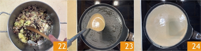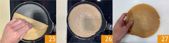 Gut mischen, um eine homogene Masse zu erhalten 22. Den Teig wieder aufnehmen und eine gefettete 25 cm Crêpe-Pfanne erhitzen. Eine Kelle Teig in die Mitte gießen 23 und die Pfanne bewegen, damit sich der Teig gleichmäßig verteilt 24.
