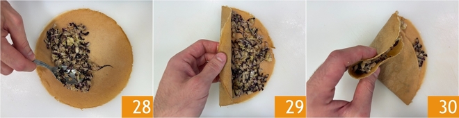 Zu diesem Zeitpunkt jede Crêpe füllen, indem ein Viertel der Füllung auf die Hälfte der Oberfläche verteilt wird 28. Zuerst in der Mitte falten 29, dann erneut in der Mitte falten 30.