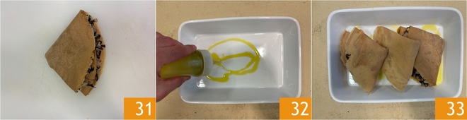 So erhalten Sie ein Dreieck 31. Einen Schuss Öl in eine Auflaufform geben 32, in der sie bequem Platz finden 33 und im vorgeheizten Ofen bei 150°C 10 Minuten erhitzen.