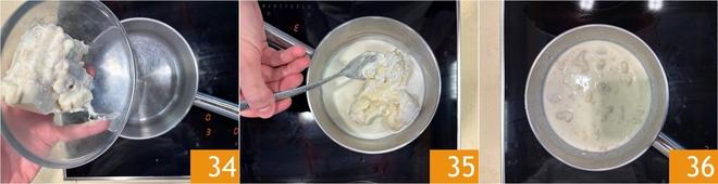 Während die Crêpes im Ofen sind, sich der Gorgonzolasauce widmen: In einem kleinen Topf den Gorgonzola 34 und die Sahne 35 hinzufügen, dann bei niedriger Hitze etwa 3 Minuten schmelzen lassen 36, unter Rühren, bis eine samtige Creme entsteht.
