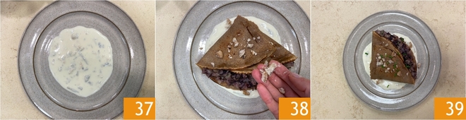 Anrichten, indem die warme Käsesauce auf dem Boden verteilt wird 37, dann eine Crêpe darauflegen und mit ein paar Kastanienstücken 38 und etwas frischem Schnittlauch garnieren. Sofort servieren Ihre Kastanien- und Radicchio-Crêpes mit Gorgonzola 39!