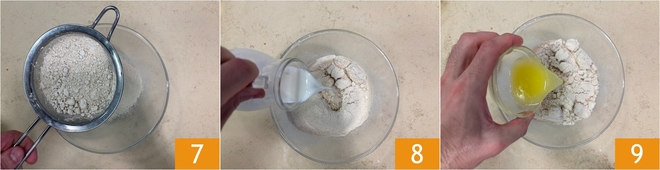 Nun widmen Sie sich dem Teig: In einer Schüssel das Kastanienmehl sieben 7, dann die Milch 8 und die geschmolzene Butter 9 hinzufügen.