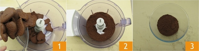 Um die Keks-Torte ohne Backen zuzubereiten, bereiten Sie zuerst den Boden vor. Geben Sie die Kakaokekse in einen Mixer 1 und mixen Sie sie, bis sie Pulver werden 2. Geben Sie es in eine Schüssel 3 und stellen Sie es beiseite.