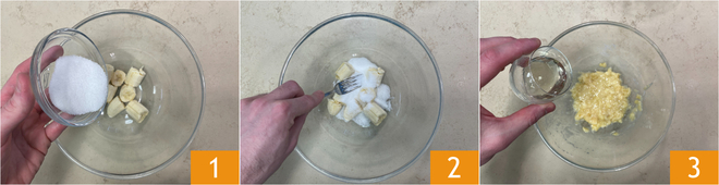 Für die Zubereitung der Kekse mit reifen Bananen die Banane in Stücke in eine Schüssel geben, den Zucker 2 dazugeben und mit einer Gabel 2 zerdrücken, bis ein Püree entsteht. Jetzt das Pflanzenöl 3 hinzufügen.