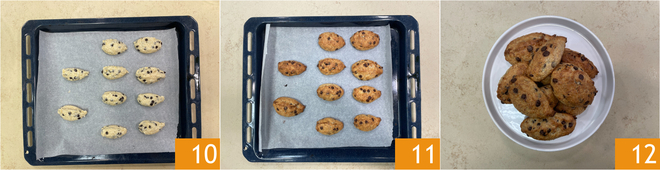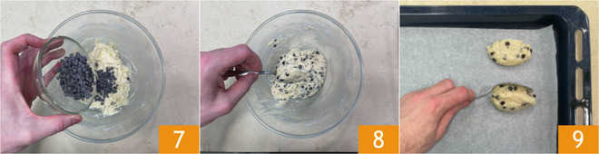 Zum Schluss die Schokotropfen 7 zugeben und umrühren 8. Mit zwei Löffeln Nocken formen und diese auf ein mit Backpapier belegtes Backblech legen 9.