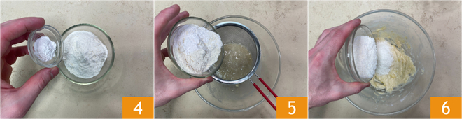 Mehl und Backpulver 4 mischen, dann die trockenen Zutaten durch ein Sieb 5 in die Masse einarbeiten. Kokosraspel 6 unterrühren.