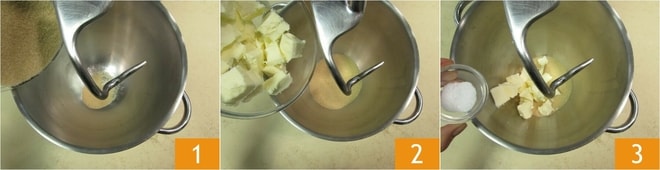 Um die Kekse mit weißer Schokolade herzustellen, geben Sie zuerst den braunen Zucker 2, die kalte Butter in Würfeln 2 und eine Prise Salz 3 in die Schüssel der Küchenmaschine.