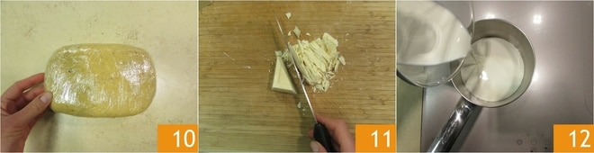 Wickeln Sie ihn in Frischhaltefolie 10 und lassen Sie ihn mindestens 30 Minuten im Kühlschrank ruhen. In der Zwischenzeit bereiten Sie die Ganache vor: Hacken Sie die weiße Schokolade mit einem Messer 11. Gießen Sie die Sahne in einen kleinen Topf 12, bringen Sie sie zum Kochen und schalten Sie dann den Herd aus.