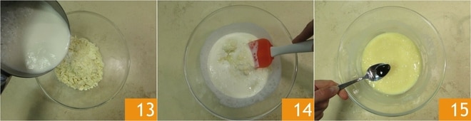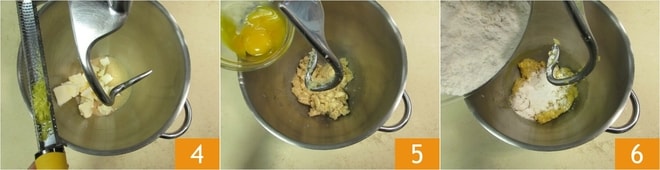 Fügen Sie auch die Schale einer halben Zitrone hinzu 4 und arbeiten Sie die Zutaten mit dem Rührhaken. Fügen Sie nach ein paar Minuten die kalten Eigelbe hinzu 5 und arbeiten Sie die Mischung noch ein paar Minuten weiter. Fügen Sie das Mehl 00 hinzu 6.