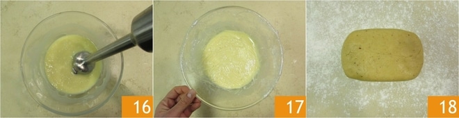 Emulgieren Sie die Creme mit dem Stabmixer 16. Decken Sie sie mit Frischhaltefolie ab 17 und stellen Sie sie für 30 Minuten in den Kühlschrank. Nehmen Sie den Mürbeteig und legen Sie ihn auf das bemehlte Nudelbrett 18.