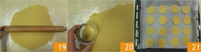 Rollen Sie den Mürbeteig etwa ½ cm dick aus 19 und schneiden Sie 32 Scheiben mit einem 6 cm Durchmesser Ausstecher aus 20. Legen Sie 16 Scheiben auf ein mit Backpapier ausgelegtes Blech 21.