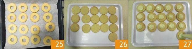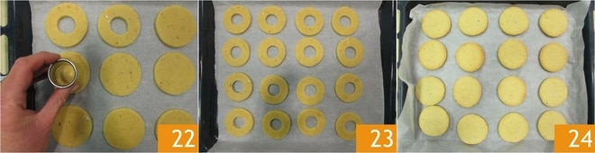 Machen Sie dasselbe mit den anderen 16 Scheiben, indem Sie diese in der Mitte mit einem 2,5 cm Ausstecher ausstechen 22 23. Backen Sie die vollen und ausgehöhlten Kekse bei 180° für 15 Minuten. Nehmen Sie sie aus dem Ofen und lassen Sie sowohl die Scheiben 24 als auch die ausgehöhlten Kekse 25 vollständig abkühlen. Legen Sie die vollen Kekse auf ein Tablett 26.