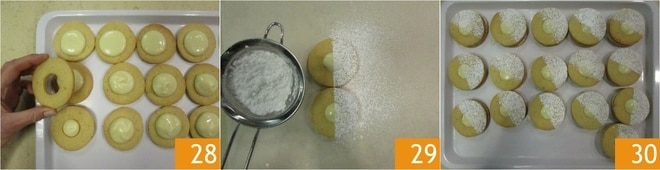 Beenden Sie, indem Sie die Kekse mit dem Loch darauflegen 28 und mit den Fingern leicht drücken, um die Ganache-Füllung gleichmäßig zu verteilen. Lassen Sie sie 15 Minuten im Kühlschrank ruhen. Dekorieren Sie schließlich mit Puderzucker nach Belieben: Wir haben ein Blatt über die Hälfte des Kekses gelegt, um ein attraktives Muster zu erzeugen 29. Die Kekse mit weißer Schokolade sind bereit zum Genießen 30!