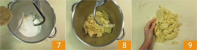 und das Haselnussmehl 7. Kneten Sie, bis Sie einen gleichmäßigen und kompakten Mürbeteig erhalten 8. Übertragen Sie ihn auf die Arbeitsfläche, arbeiten Sie den Mürbeteig schnell mit den Händen 9 zu einem Teigballen.