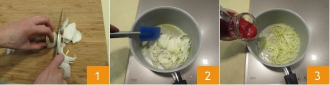 Um die Ketchup-Soße vorzubereiten, schälen Sie die Zwiebeln und schneiden Sie sie fein 1. Gießen Sie das Öl in einen Topf, fügen Sie die Zwiebeln hinzu und lassen Sie sie 4-5 Minuten weich werden, gelegentlich umrühren 2. An diesem Punkt fügen Sie auch das Tomatenpüree hinzu 3