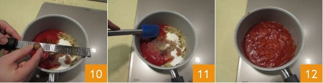 Zum Schluss aromatisieren Sie mit frisch geriebener Muskatnuss 10 und mischen alles 11. Lassen Sie es für 1 Stunde und 20 Minuten bei geringer Hitze kochen 12 und rühren Sie gelegentlich um, um zu verhindern, dass die Mischung am Boden kleben bleibt.