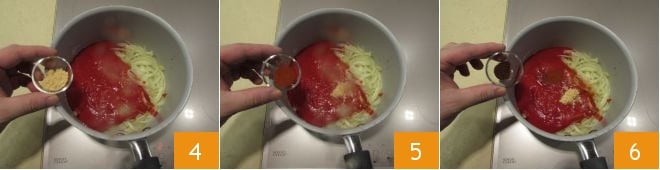 das Ingwerpulver 4, das Paprikapulver 5 und die fein gehackten Nelken 6.