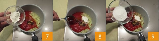 Dann fügen Sie das Mehl 7, den Rotweinessig 8, den Zucker 9 und das Salz hinzu.