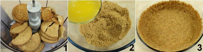 Um die Key Lime Pie zuzubereiten, beginnen Sie damit, die Kekse in eine Küchenmaschine zu geben 1 und sie fein zu mahlen. Dann geben Sie sie in eine Schüssel, in die Sie den Zucker (oder Rohrzucker, wenn Sie möchten) hinzufügen; mischen Sie alles und fügen Sie die geschmolzene Butter hinzu 2, dann mischen Sie die Zutaten gut. Kleiden Sie mit der Mischung die Seiten und den Boden einer Tortenform mit schrägen Rändern und einem Durchmesser von 20 cm aus 3. Helfen Sie sich dabei, indem Sie mit den Händen oder dem Rücken eines Löffels drücken. Stellen Sie die Form bei 180°C für etwa 10 Minuten in den Ofen, dann nehmen Sie sie heraus und lassen Sie sie vollständig auf einem Gitter abkühlen.