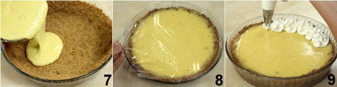 Gießen Sie die erhaltene Creme in die mit der zerkrümelten Keksmasse ausgelegte Tortenform (inzwischen kalt) 7 und backen Sie sie bei 180°C für 15 Minuten. Nach Ablauf der Backzeit nehmen Sie die Key Lime Pie heraus und lassen Sie sie vollständig abkühlen, dann decken Sie sie mit Frischhaltefolie ab 8 und stellen Sie sie für mindestens 4 Stunden (besser über Nacht) in den Kühlschrank. Vor dem Servieren der Key Lime Pie, schlagen Sie die frische Sahne mit dem Zucker und bedecken Sie die Oberfläche des Kuchens (außer einem kleinen Teil in der Mitte) mit der erhaltenen Mischung, indem Sie Rosetten aus Sahne formen 9. Alternativ zur Sahne können Sie auch eine italienische Baiser zubereiten und damit die Key Lime Pie auf die gleiche Weise überziehen.
