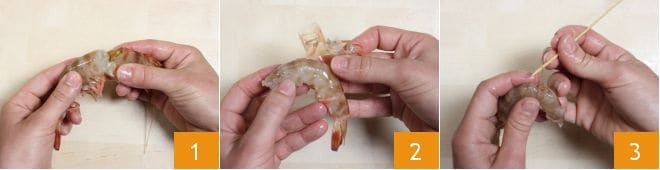 Um den Kichererbsen-Garnelen-Rucola-Salat zuzubereiten, beginnen Sie mit dem Reinigen der Garnelen (oder der Riesengarnelen), entfernen Sie den Kopf 1, den Panzer 2 und den Darm mit einem Holzstäbchen 3, für alle Details zu diesem Verfahren konsultieren Sie unser Blatt Wie man Garnelen reinigt in der Kochschule.