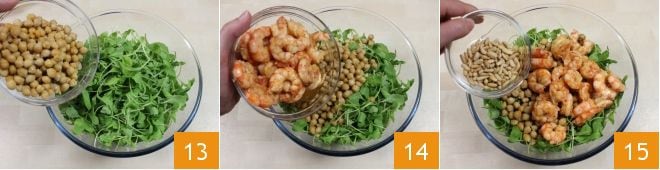 Fügen Sie die Kichererbsen 13, die Riesengarnelen 14 und die gerösteten Pinienkerne 15 hinzu.
