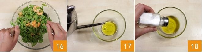 Mischen Sie den Salat 16. Kümmern Sie sich schließlich um das Dressing: Bereiten Sie eine Emulsion mit Öl 17, Salz 18, Pfeffer vor.