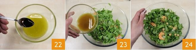 abschließen mit einem Teelöffel Balsamico-Essig 22. Den Salat mit dem vorbereiteten Dressing würzen 23. Ihr Kichererbsen-Garnelen-Rucola-Salat ist nun bereit, serviert zu werden 24 !