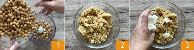 Um die Kichererbsen-Nuggets zuzubereiten, lassen Sie die vorgegarten Kichererbsen abtropfen und geben Sie sie in einen Mixer 1, dann pürieren Sie sie zu einem Brei 2. Fügen Sie den Frischkäse hinzu 3.