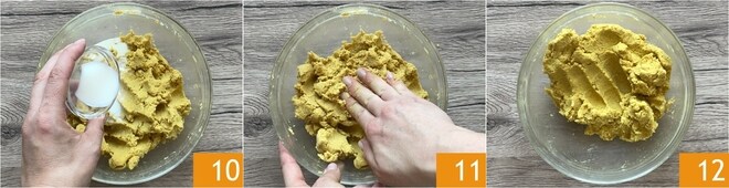 Erweichen Sie die Mischung mit der Milch 10 und mischen Sie sie gut mit den Händen 11, bis eine homogene Konsistenz erreicht ist 12. Lassen Sie die Mischung für 30 Minuten im Kühlschrank fest werden.
