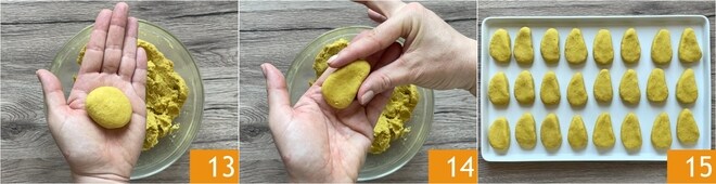 Nach der Festigungszeit nehmen Sie etwa 25 g schwere Portionen aus der Mischung und drücken sie leicht zwischen den Handflächen 13, dann formen Sie sie mit den Fingern zu einer Tropfenform 14. Mit diesen Mengen erhalten Sie etwa 24 Nuggets 15.