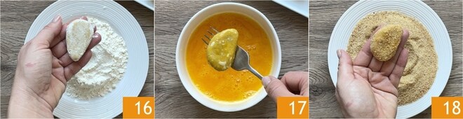 Wenden Sie jede Kugel zuerst im Mehl 16 und dann in den zuvor mit einer Prise Salz verquirlten Eiern 17 und bedecken Sie sie schließlich mit Semmelbröseln 18.