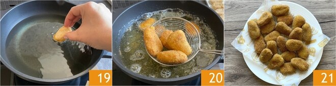 Jetzt sind Sie bereit zum Frittieren: Erhitzen Sie das Pflanzenöl auf eine Temperatur von 170°-180° und tauchen Sie wenige Stücke gleichzeitig ein 19. Frittieren Sie sie etwa eine Minute von jeder Seite, bis sie schön goldbraun sind 20, dann lassen Sie sie auf Küchenpapier abtropfen 21. Servieren Sie die Kichererbsen-Nuggets noch heiß!