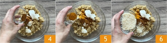 Würzen Sie mit Paprika 4 und Kurkuma 5, dann fügen Sie den geriebenen Grana Padano DOP hinzu 6.