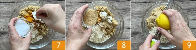 Salzen 7 und pfeffern Sie. Fügen Sie schließlich die Semmelbrösel 8 und die geriebene Zitronenschale hinzu 9.