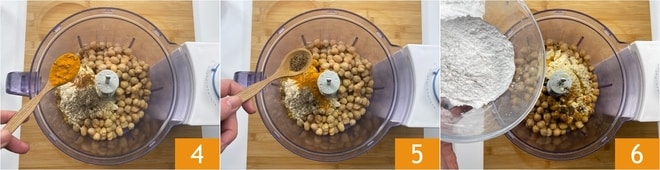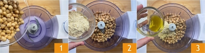 In die Schüssel eines Mixers die zuvor gespülten und abgetropften Kichererbsen 1, das Kichererbsenmehl 2, das Öl 3, Salz und Pfeffer geben.