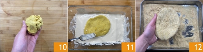 Nehmen Sie nun etwa 120 g große Stücke der Masse und formen Sie eine Kugel 10, drücken Sie sie dann zwischen den Händen flach, um ihr die Form eines Schnitzels zu geben. Erst in den Teig 11 und dann in das Paniermehl 12 tauchen.