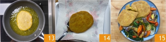 Braten Sie jedes Schnitzel in einer Pfanne mit einem Fingerbreit Öl 13, bis es goldbraun ist. Es dauert 2-3 Minuten pro Seite; helfen Sie sich mit einem Pfannenwender, um es zu wenden, und lassen Sie es dann auf saugfähigem Papier 14 abtropfen. Fahren Sie auf diese Weise fort, bis Sie alle zubereitet haben, und servieren Sie Ihre Kichererbsen-Schnitzel mit einem Gemüsesalat 15.
