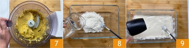 Alles schließen und sehr gründlich pürieren 7. Zunächst erscheint die Mischung sehr trocken und mehlig, aber durch weiteres Pürieren wird sie dicker und Sie erhalten eine formbare Masse. Sie können bei Bedarf noch etwas Öl oder einen Esslöffel Wasser hinzufügen, wenn sie zu kompakt ist. Bereiten Sie den Teig zu: In eine Schüssel Mehl und Wasser geben. Gut mit einer Gabel 8 vermischen und mit Salz 9 abschmecken.
