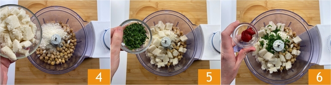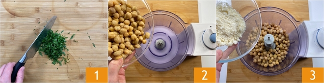 Um die Kichererbsenbällchen zuzubereiten, hackt zuerst die Petersilie 1 und stellt sie beiseite. Gebt die zuvor abgespülten und abgetropften Kichererbsen in den Mixer 2. Fügt den geriebenen Parmesan hinzu 3.