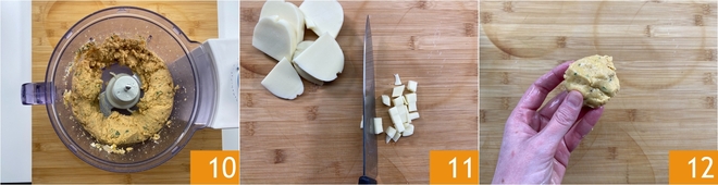 Püriert alles, bis ihr eine glatte und formbare Masse erhaltet, ähnlich wie ein sehr dickes Hummus 10. Schneidet den Provola in sehr kleine Stücke 11. Nun formt ihr die Bällchen: Nehmt 35 g der Masse mit eingeölten oder befeuchteten Händen 12 und drückt sie leicht in der Handfläche.