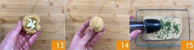 Legt ein paar Stücke Provola in die Mitte 13 und schließt sie so, dass ein rundes Bällchen entsteht, das den Käse im Inneren einschließt 14. Gebt nun das Paniermehl in eine Auflaufform, fügt die gehackte Petersilie und eine Prise Pfeffer hinzu 15. Vermischt es.