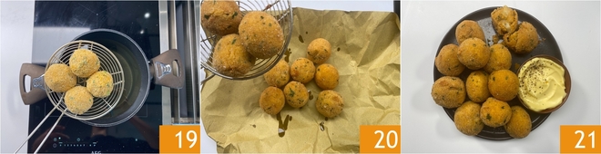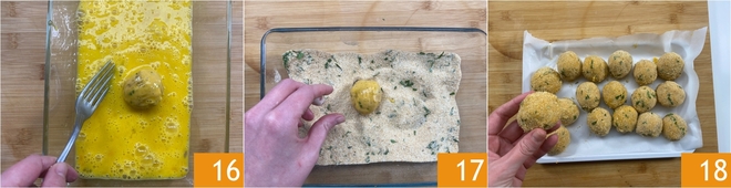 Kümmert euch um die Panade. Wälzt jedes Bällchen in dem mit einer Prise Salz verquirlten Ei 16 und dann im frisch zubereiteten Paniermehl 17. Sobald die Bällchen fertig sind, legt sie auf ein Tablett 18.