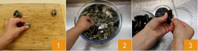Um das Muschel- und Venusmuschelsauté vorzubereiten, beginnt damit, die Venusmuscheln auszuspülen: Entfernt die mit einem beschädigten Schale, indem ihr sie jeweils auf der Öffnungsseite auf ein Schneidebrett klopft 1. Wenn dunkler Sand austritt, bedeutet das, dass die Muschel mit Sand gefüllt ist und weggeworfen werden muss. Dann legt die Venusmuscheln in ein Sieb, das auf einer Schüssel liegt, und spült sie mehrmals unter fließendem Wasser ab 2, bis kein Sand mehr in der Schüssel sichtbar ist. Wascht auch die Miesmuscheln, entfernt das Byssus, die faserige Strähne, die aus der Schale ragt 3, und schrubbt die Muschelschale mit einem Schwamm, um Verunreinigungen zu entfernen.