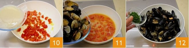 Lasst die Kirschparadeiser einige Minuten kochen, während ihr umrührt. Dann gießt die Kochflüssigkeit der Muscheln dazu 10 und lasst es etwa 5 Minuten kochen, damit es einreduziert. Gebt dann die Miesmuscheln und Venusmuscheln dazu 11, kocht weitere 2-3 Minuten, schaltet den Herd aus und würzt mit gehackter Petersilie 12.