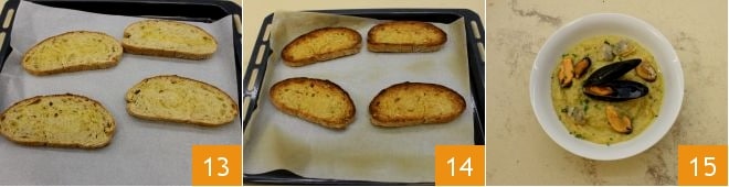 Als Beilage zum Gericht könnt ihr im Ofen heimisches Brot rösten: beträufelt die Brotscheiben mit Olivenöl, legt sie auf ein mit Backpapier ausgelegtes Blech und erhitzt sie im vorgeheizten Ofen bei 220°C etwa 10 Minuten (im Umluftofen bei 180°C etwa 5 Minuten) auf beiden Seiten (13-14). Jetzt, da alle Zutaten bereit sind, gebt die Kichererbsencremesuppe in die Servierschalen und darauf das Muschel- und Venusmuschelsauté; einige Muscheln ohne Schale, andere mit 15. Serviert die Kichererbsencremesuppe mit Muschel- und Venusmuschelsauté mit den gerösteten Brotscheiben!