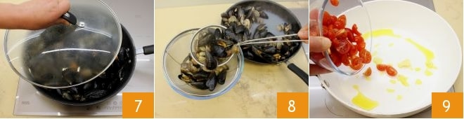Deckt die Pfanne mit einem Deckel ab und lasst die Muscheln öffnen 7: das dauert nur wenige Minuten. Sobald die Miesmuscheln und Venusmuscheln geöffnet sind, gießt sie ab und haltet sie warm 8; hebt auch die Flüssigkeit, die die Muscheln beim Öffnen abgegeben haben, in einer kleinen Schüssel auf. In einer breiten Pfanne erhitzt Olivenöl, zerdrückten Knoblauch und die Paradeiser 9.