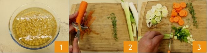 Um die Kichererbsencremesuppe zu zubereiten, sollten die getrockneten Kichererbsen mindestens 12 Stunden eingeweicht werden (am besten über Nacht). Bereitet dann das restliche Gemüse vor: schneidet und schält die Karotte 2, bereitet den Sellerie, den Lauch und den Thymian vor. Schneidet alles Gemüse in Scheiben 3 und zupft die Thymianblättchen von den Zweigen.