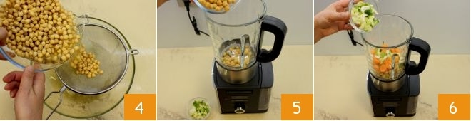 Gießt die Kichererbsen 4 aus dem Einweichwasser ab. Füllt dann Wasser in den Dampfblender bis zur maximalen Füllhöhe und gebt die Kichererbsen 5, den Lauch, die Karotten und den Sellerie in den Behälter 6.
