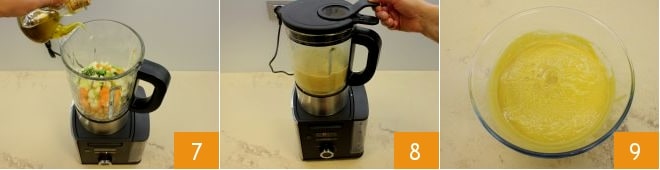 Salzt und pfeffert nach Belieben, gebt Olivenöl dazu 7 und schließt den Behälter mit dem passenden Deckel, um das gesamte Gemüse zu pürieren 8. Stellt die Kochzeit auf eine halbe Stunde ein und fügt Wasser hinzu, bis 1,5 Liter erreicht sind. Sobald die Suppe gekocht und püriert ist, ist eure Kichererbsencremesuppe fertig und kann bis zur Verwendung warmgehalten werden 9.